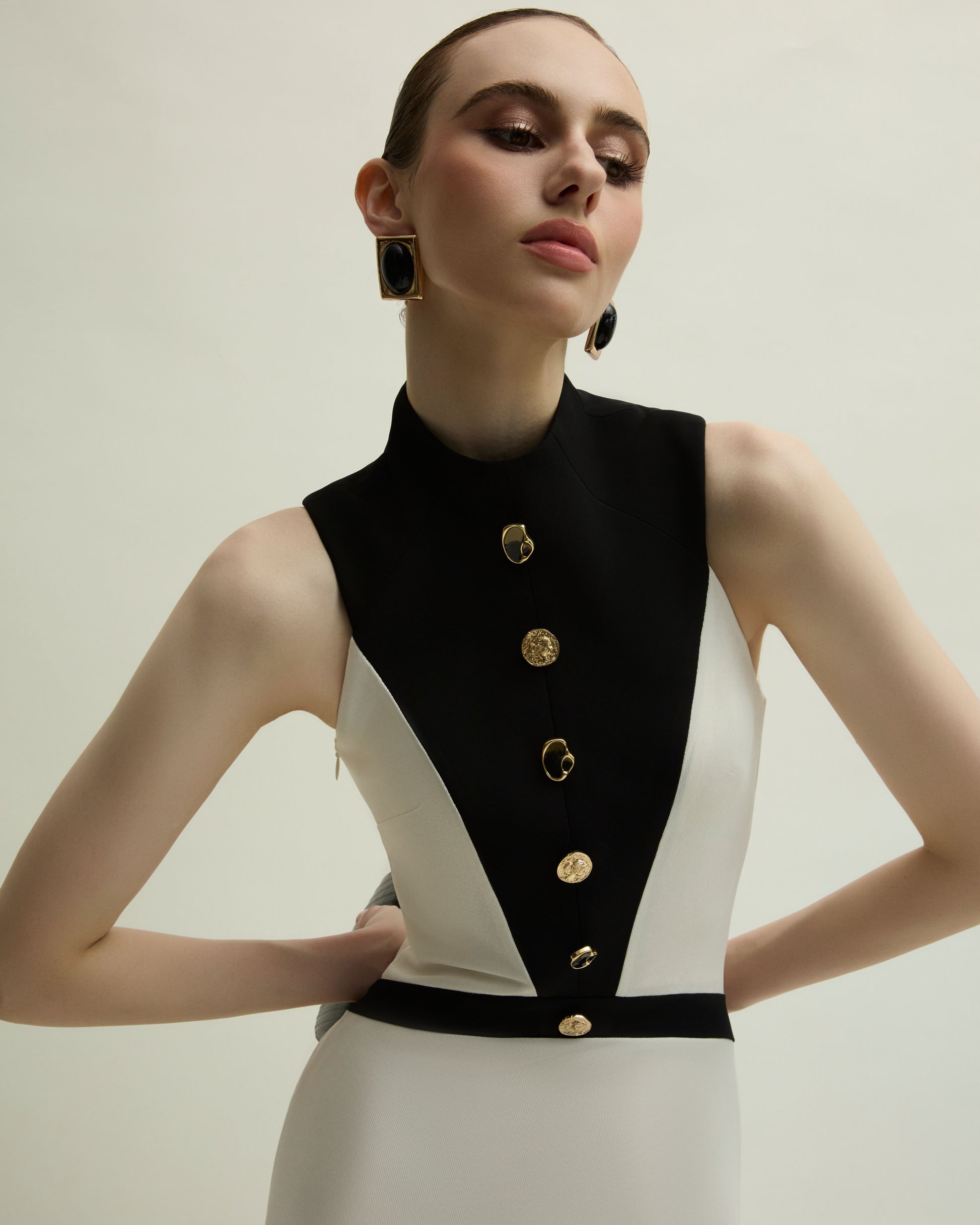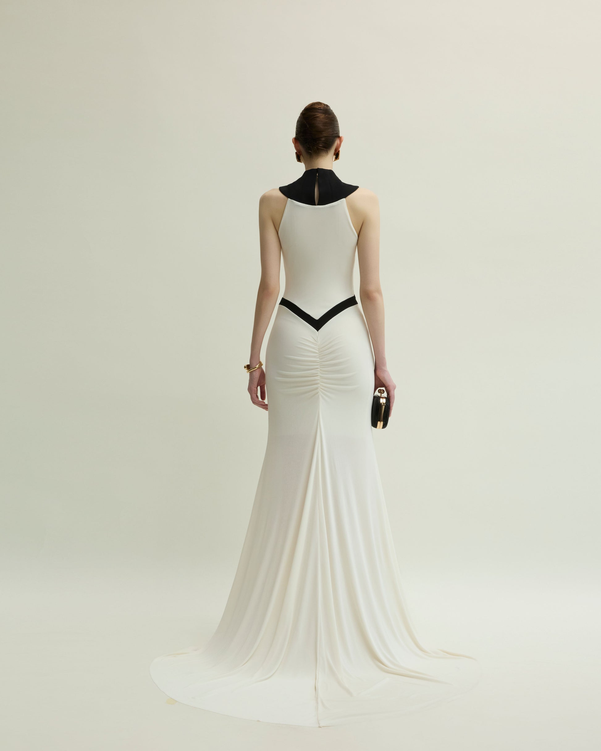 ASTER DRESS A striking mullet-cut mermaid silhouette defines the ASTER DRESS, crafted from single jersey and crepe, complete with a dramatic long train. Its V-shaped front accentuates the waist, while ruching details at the back enhance curves, and an alternating row of gold buttons adds a refined metallic accent.