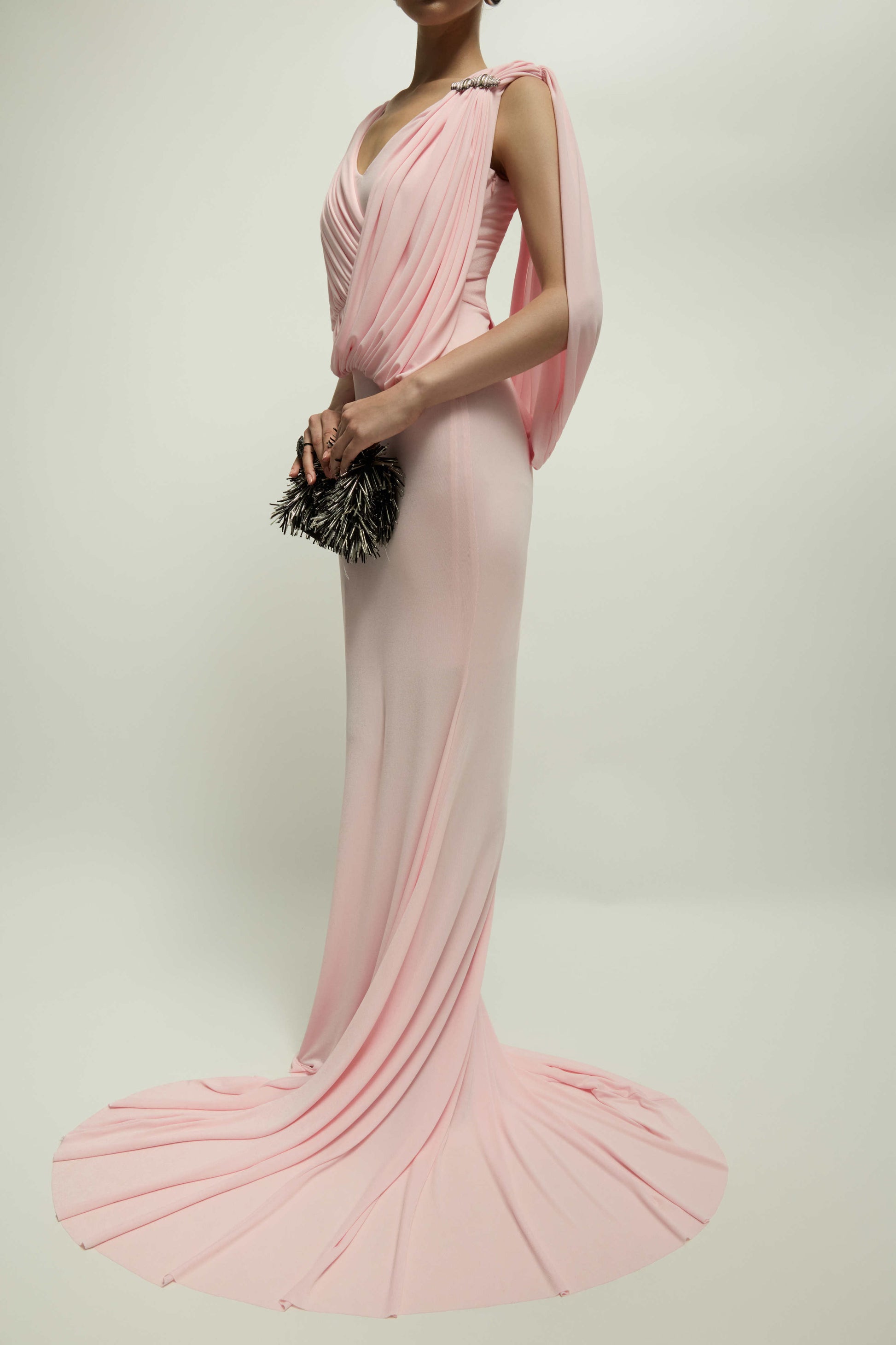 The CELIAN DRESS is designed with a striking, deep V-neckline. The draping technique creates soft folds that cascade down the body, cleverly fastened with a large clasp. The mermaid-style skirt creates a graceful and alluring silhouette that moves beautifully with the wearer.
