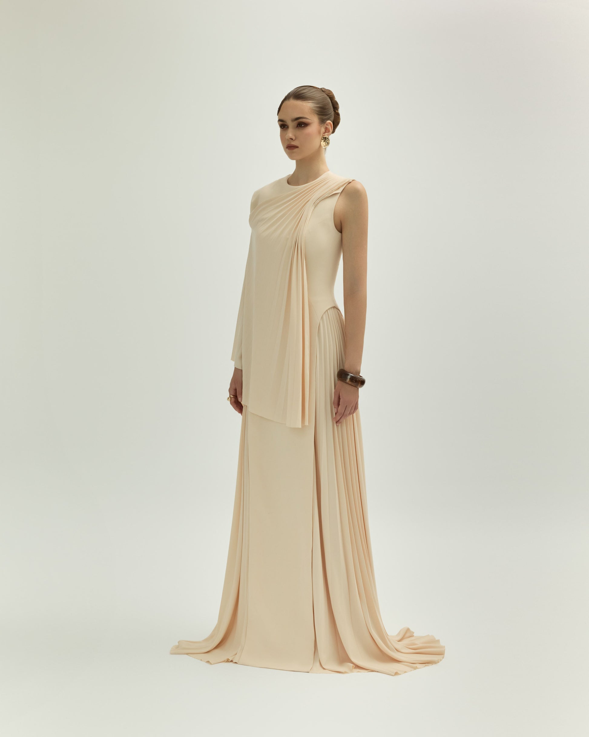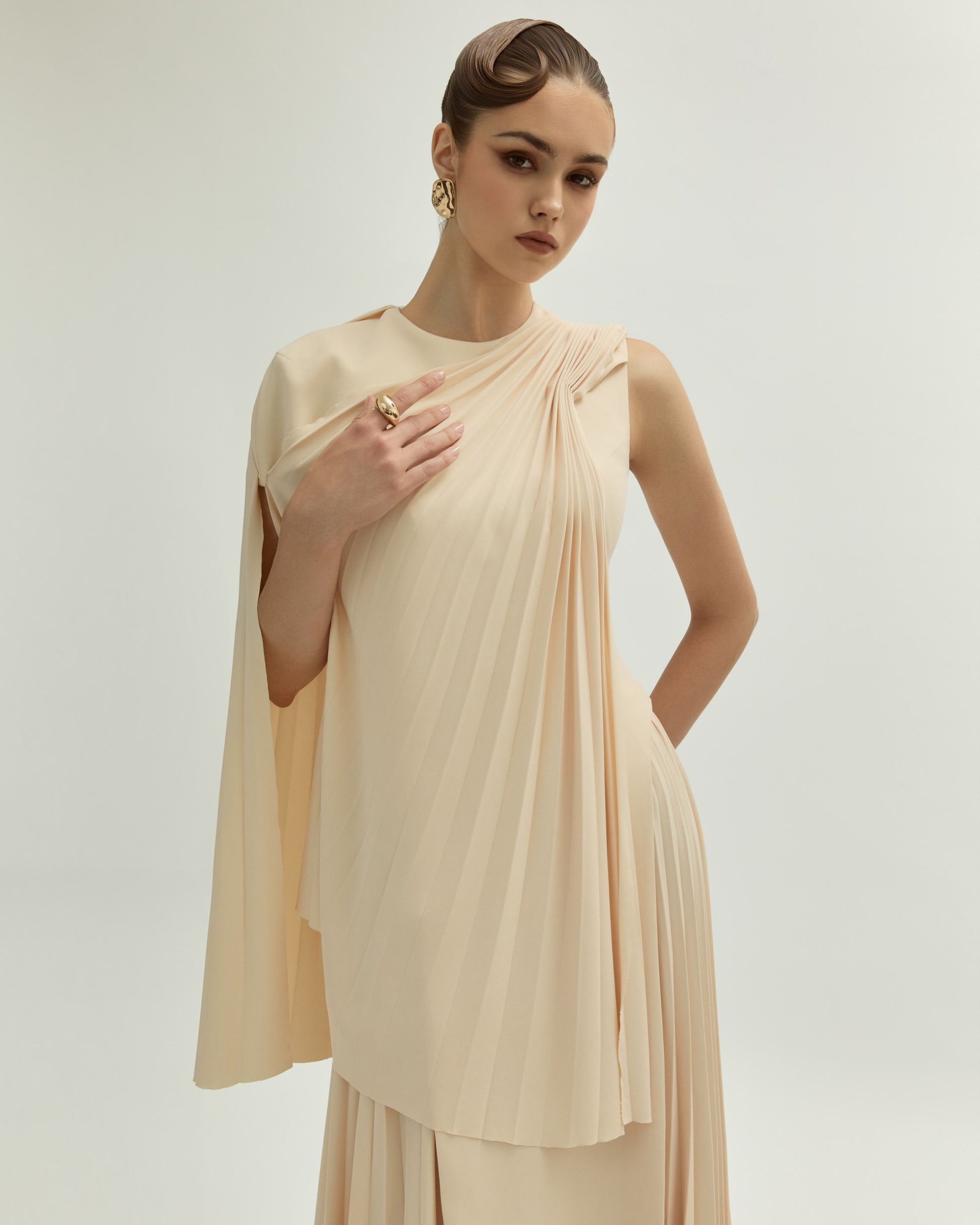 The CLEMENTINE dress is a mid-length dress in luxurious tencel crepe featuring an asymmetrical draped shoulder detail and fitted bodice. The dress showcases exquisite sunray pleating throughout the skirt with a dramatic handkerchief hem, creating graceful movement and an ethereal silhouette.