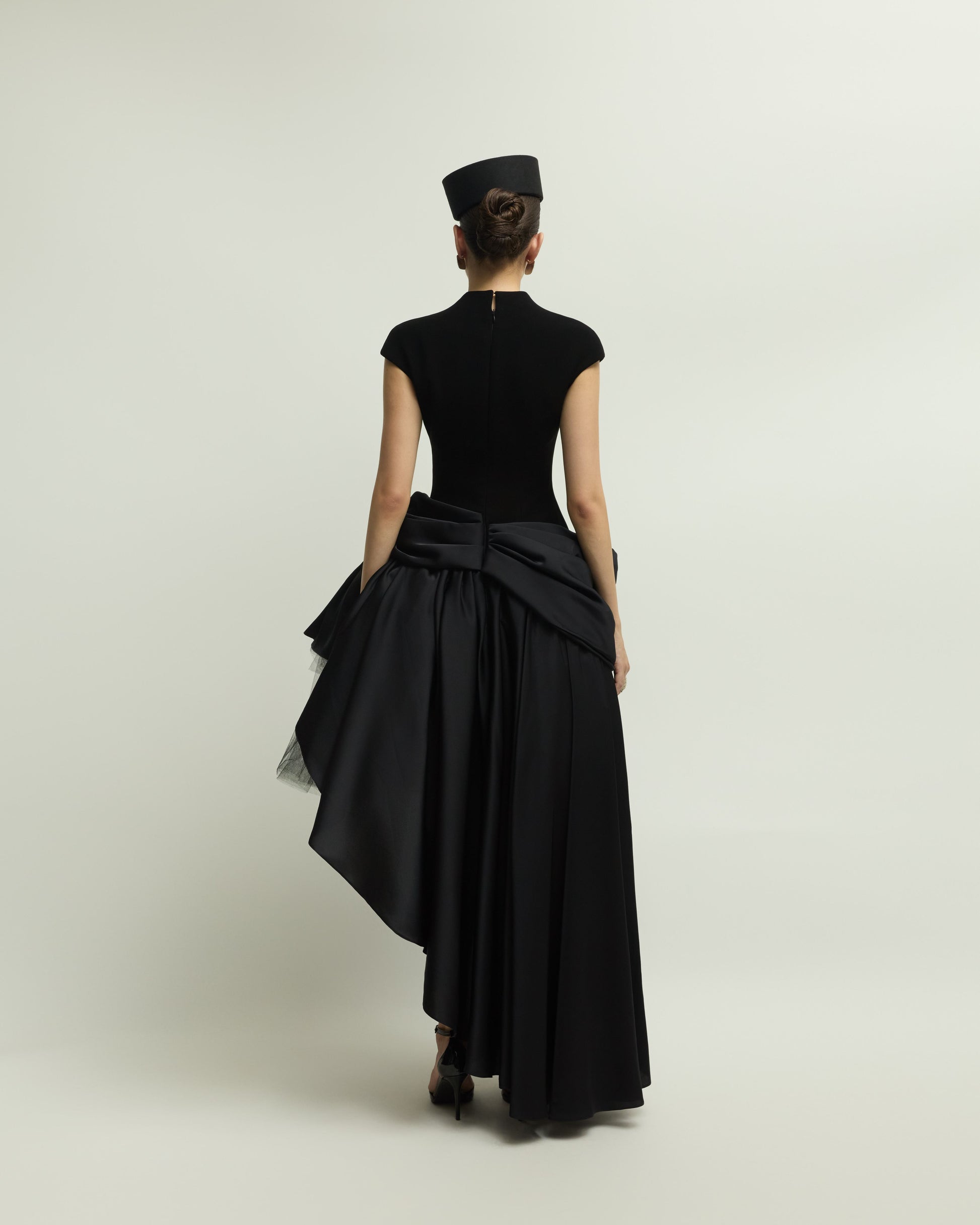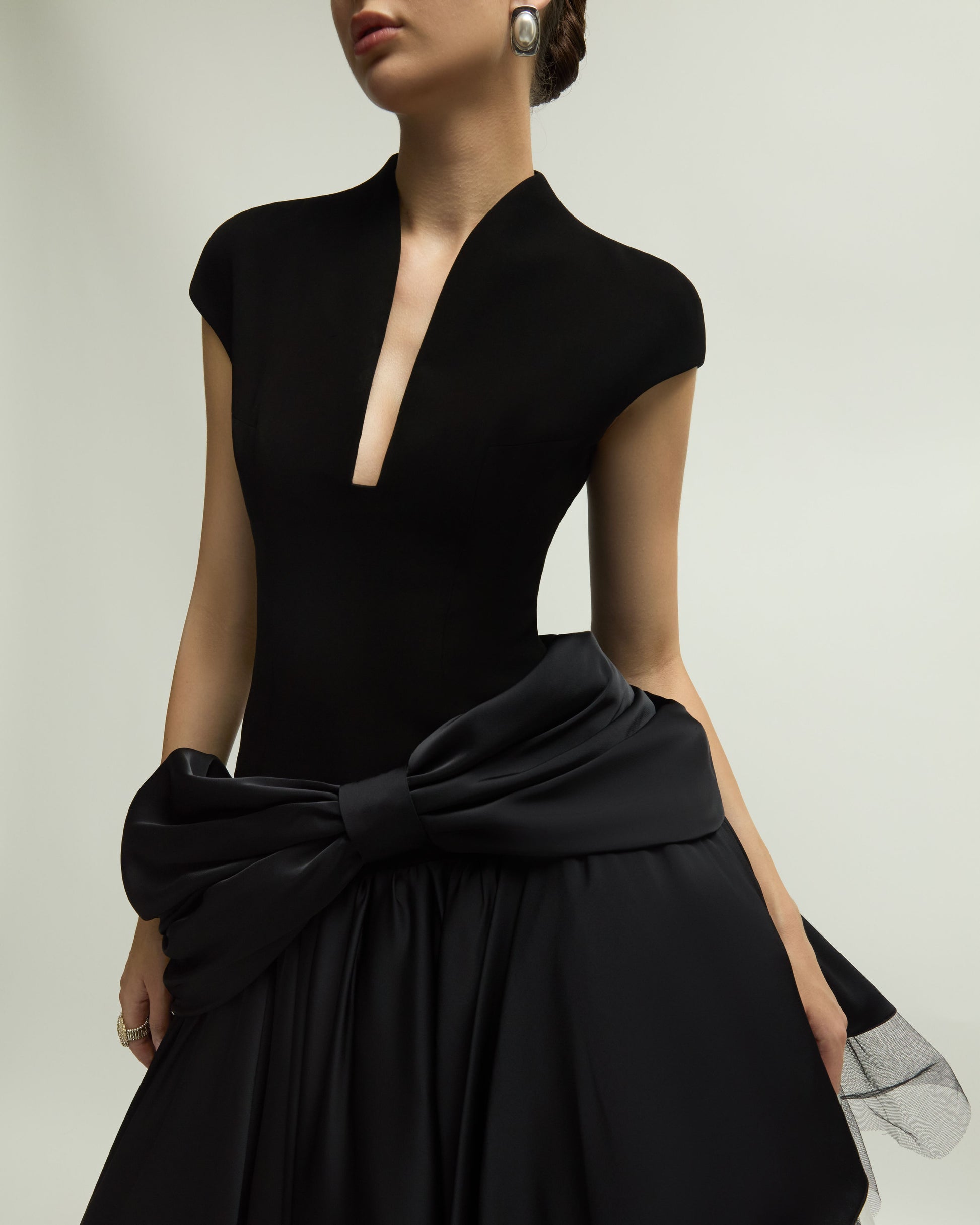 The CRAMLINGTON DRESS is a harmonious blend of contrasts. The sturdy black crepe fabric hugs the torso, opposing the glossy black satin of the skirt. The dress's silhouette is meticulously calculated, creating a striking asymmetrical hemline with the soft satin material. The V-neck and a large satin bow on the bodice are the focal points, attracting all eyes. The elegant cap sleeves give the wearer confidence and a sophisticated air.