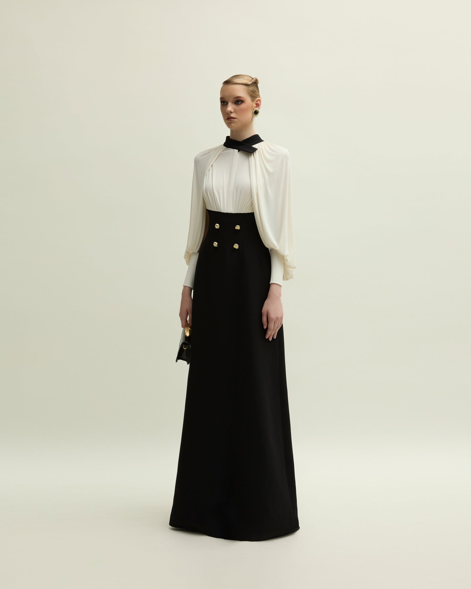 DELINA DRESS Drawing inspiration from tuxedo tailoring, the DELINA DRESS pairs a high-waisted crepe skirt, offering sharp structure, with an upper body of draped single jersey. This jersey forms dramatic cape sleeves, creating a compelling interplay of tailored lines and fluid volume for a commanding, modern statement.