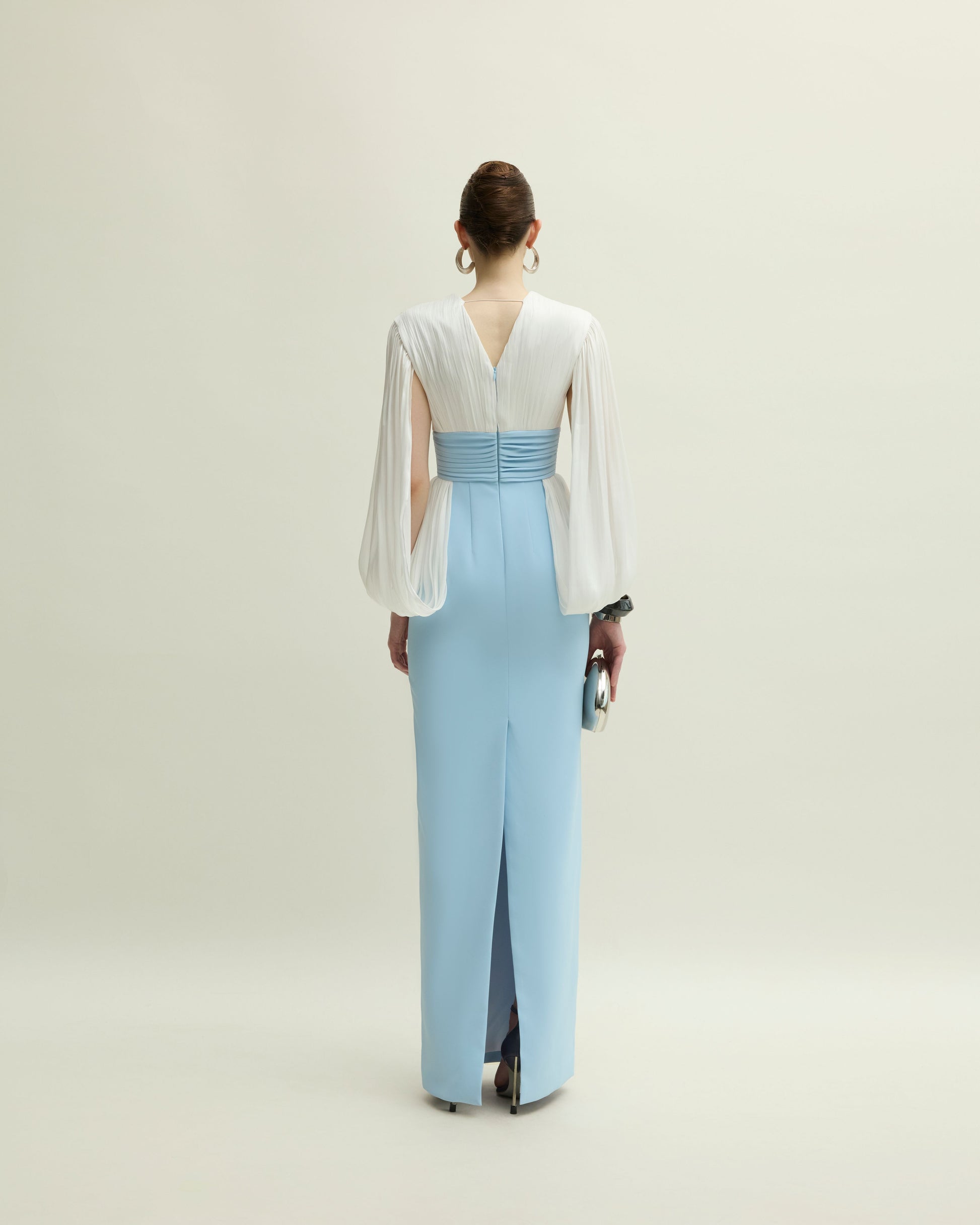 DUCHESS DRESS captivates with ethereal, draped organza cape sleeves that lend an airy, regal quality. Its crepe bodice is cinched by a cumberbund-inspired waist, featuring intricate pleating detail that sculpts the midsection, marrying sheer fluidity with tailored form for a sophisticated profile.