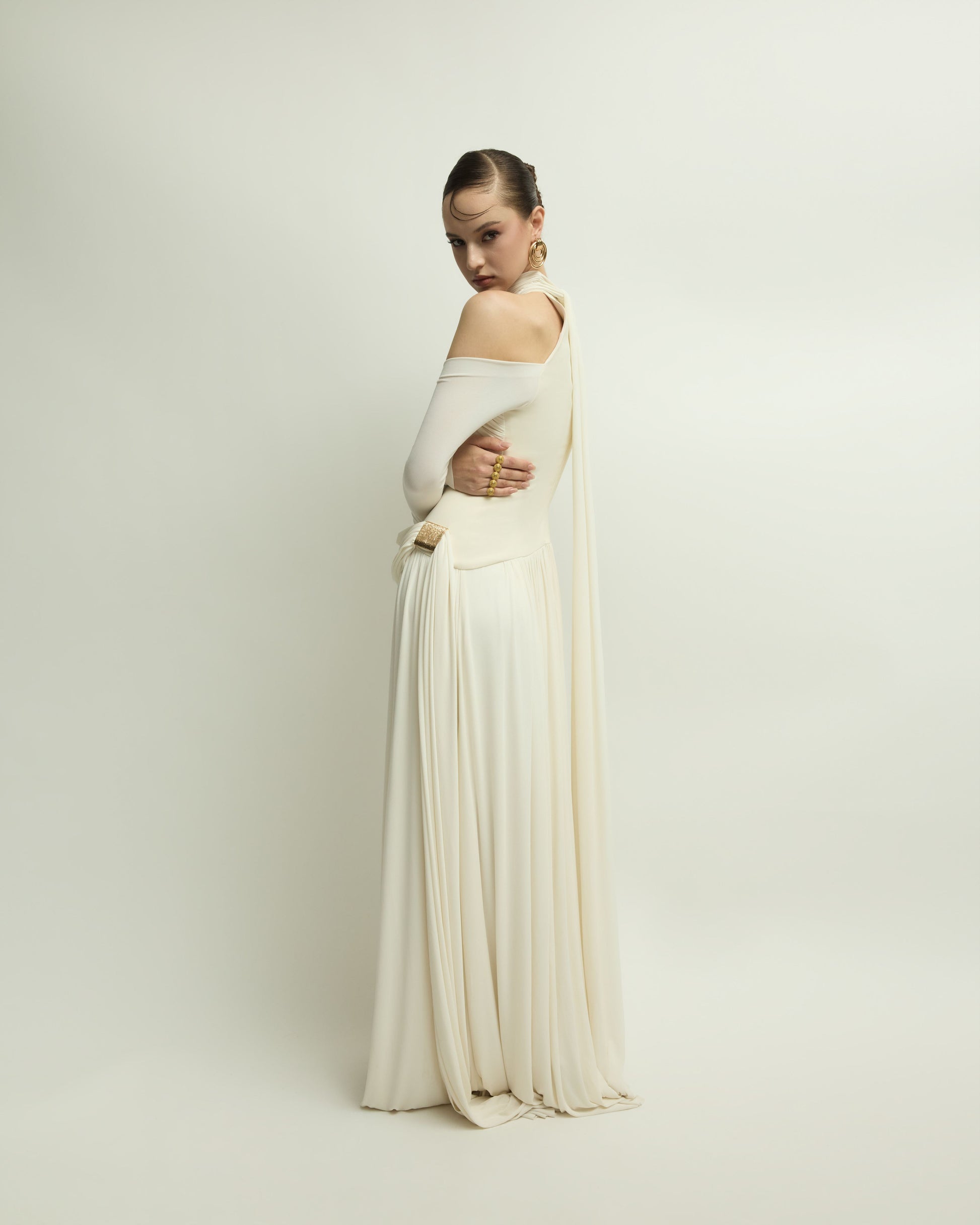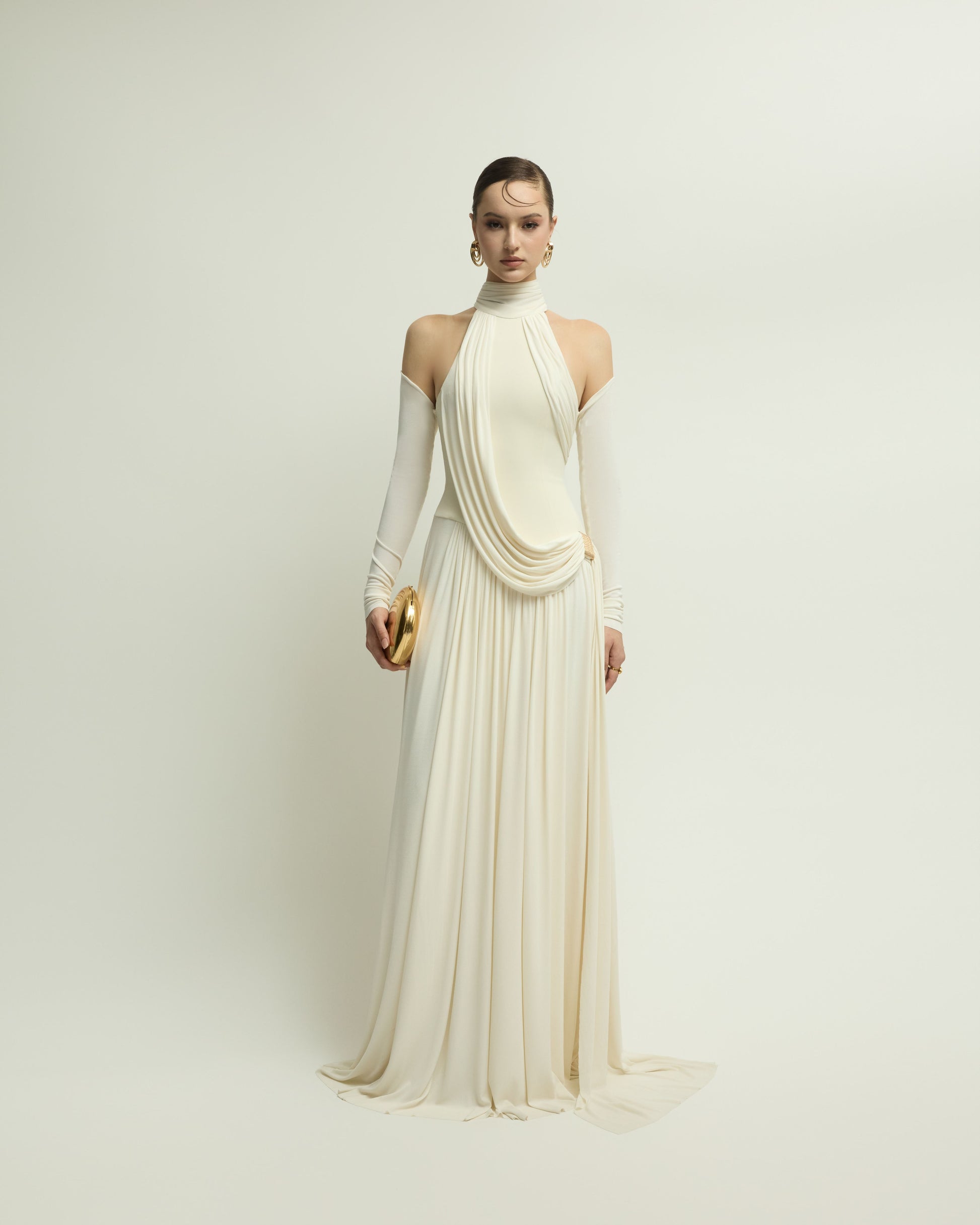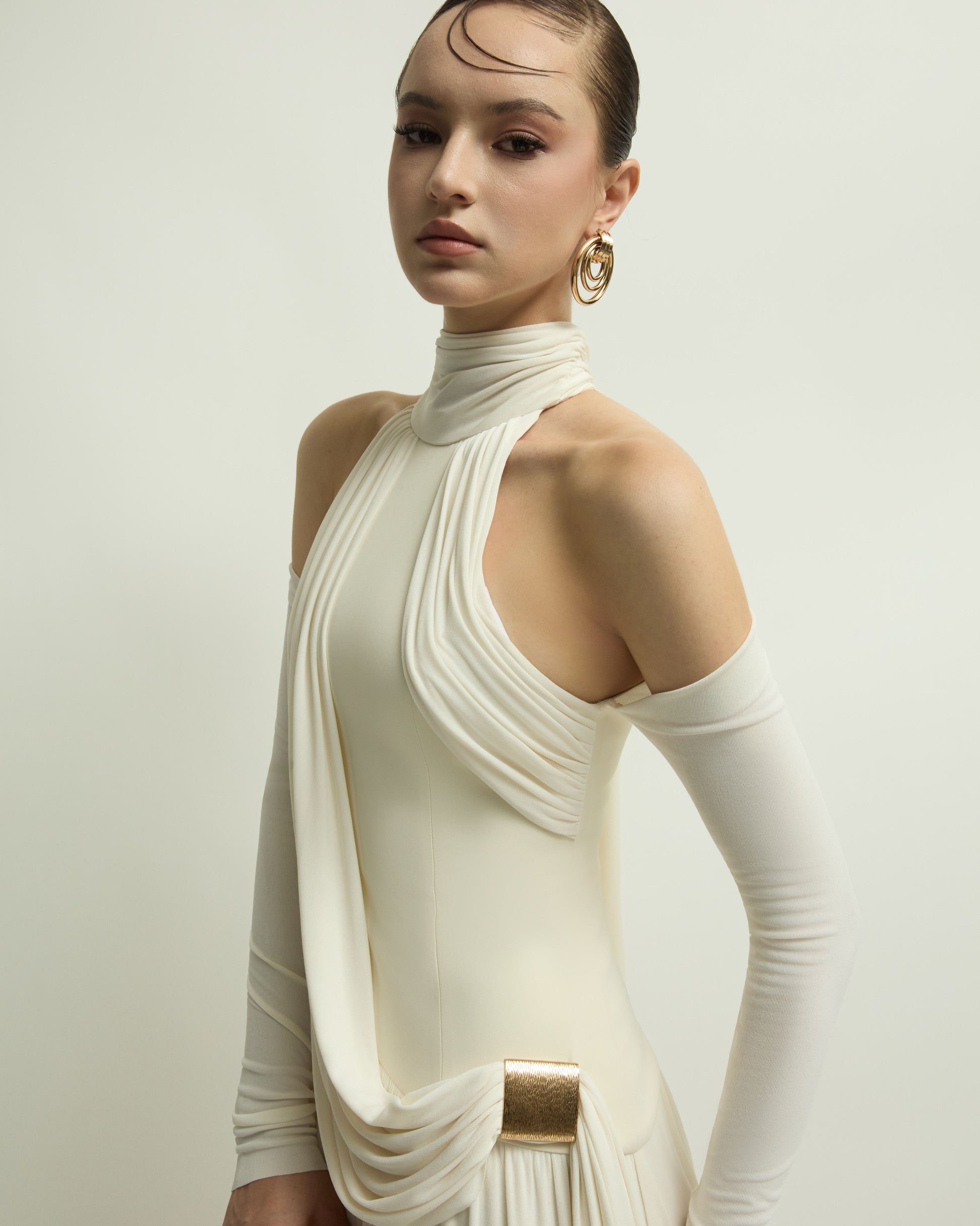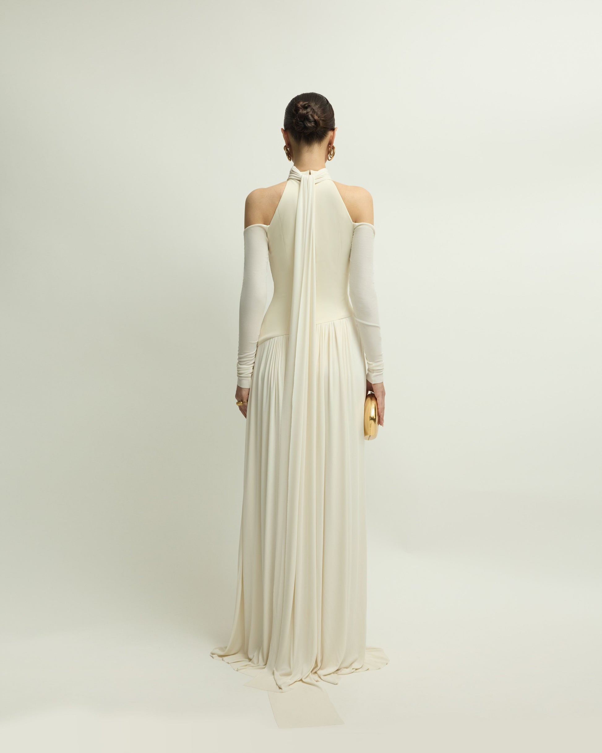 The EIRA DRESS uses draping and layering techniques to create soft gathers and folds, forming gentle curves that help conceal imperfections and enhance the wearer's femininity. The bodice is made from form-fitting cotton twill, providing a firm and structured feel. It features a halter neckline with a soft ribbon tie at the back. The long sleeves gently hug the arms, revealing a charming bare-shoulder look.