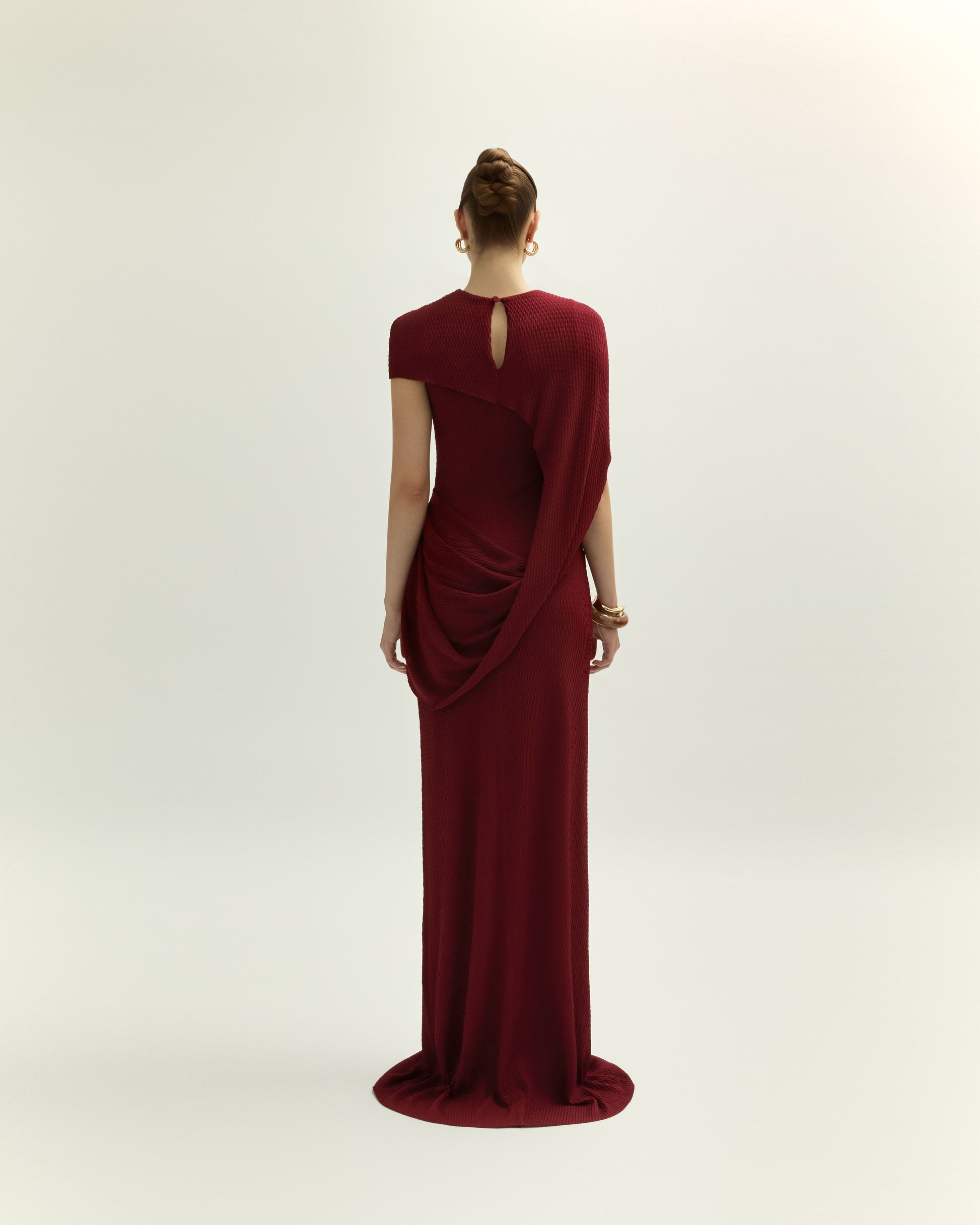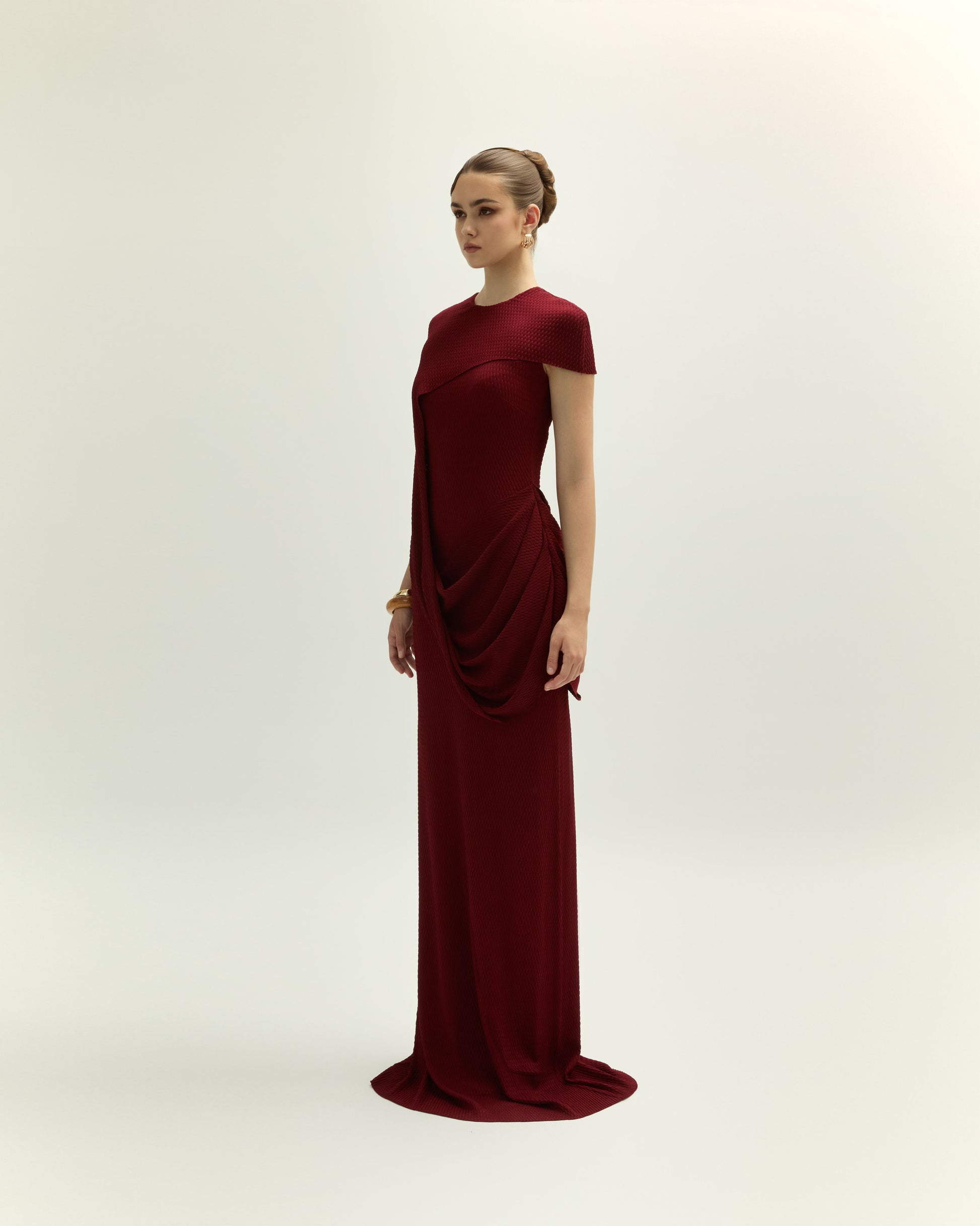 The KENSINGTON dress is a straight cut floor-length dress with draping cape, hugging around the upper body, forming a soft half-heart shape.