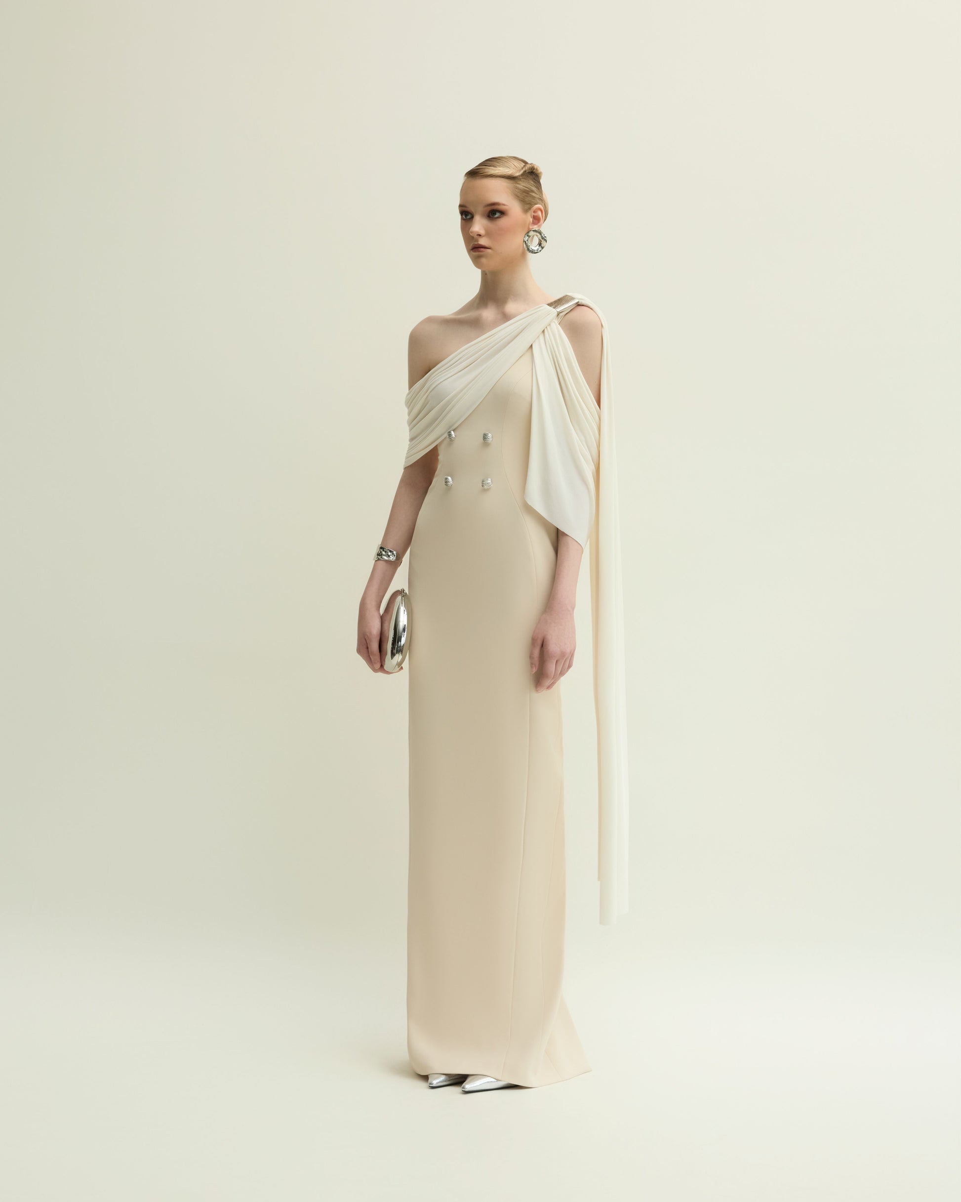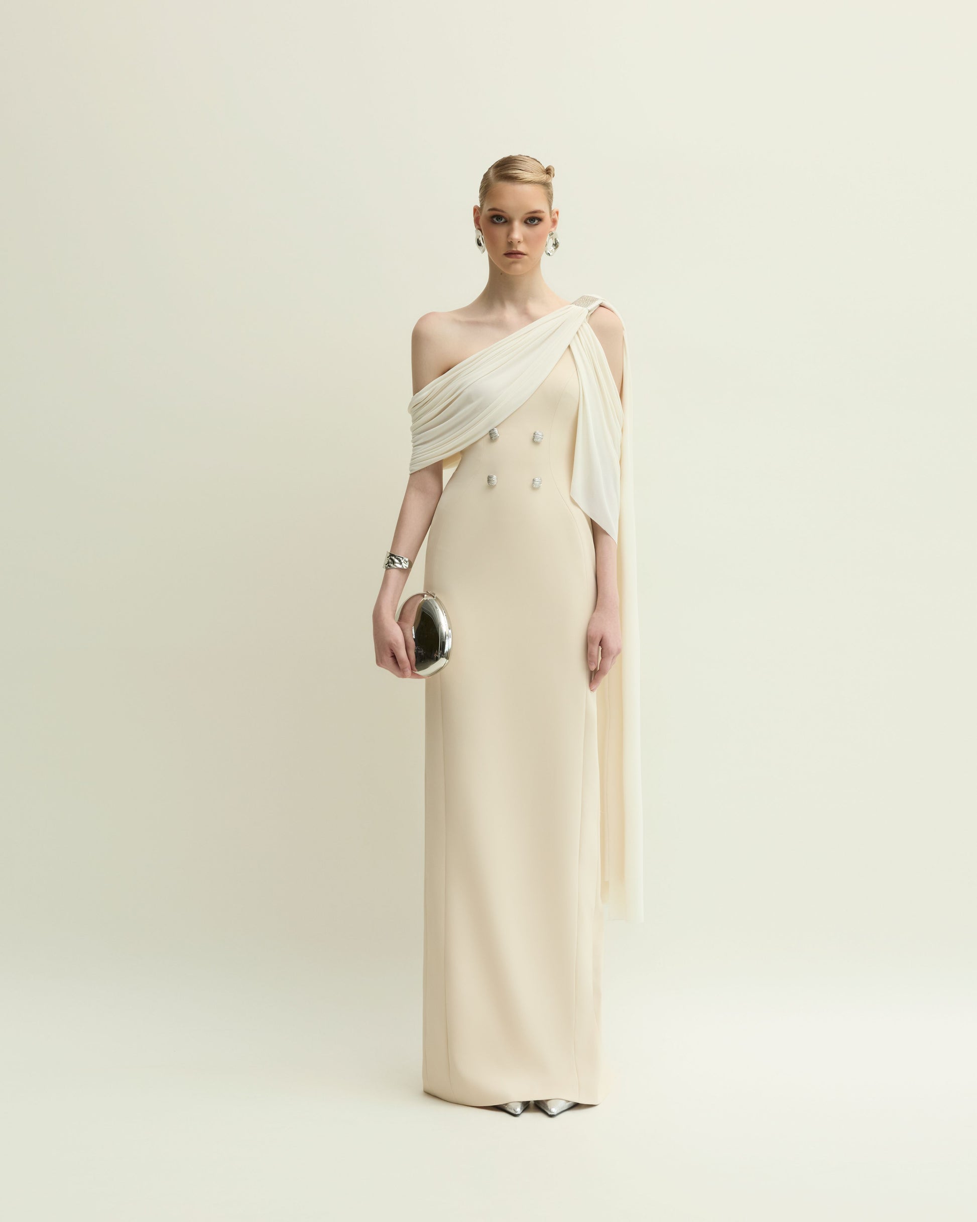Offering a modern take on eveningwear, the ROSEBERRY DRESS in crepe and single jersey is defined by a singular, draped asymmetrical cape sleeve.