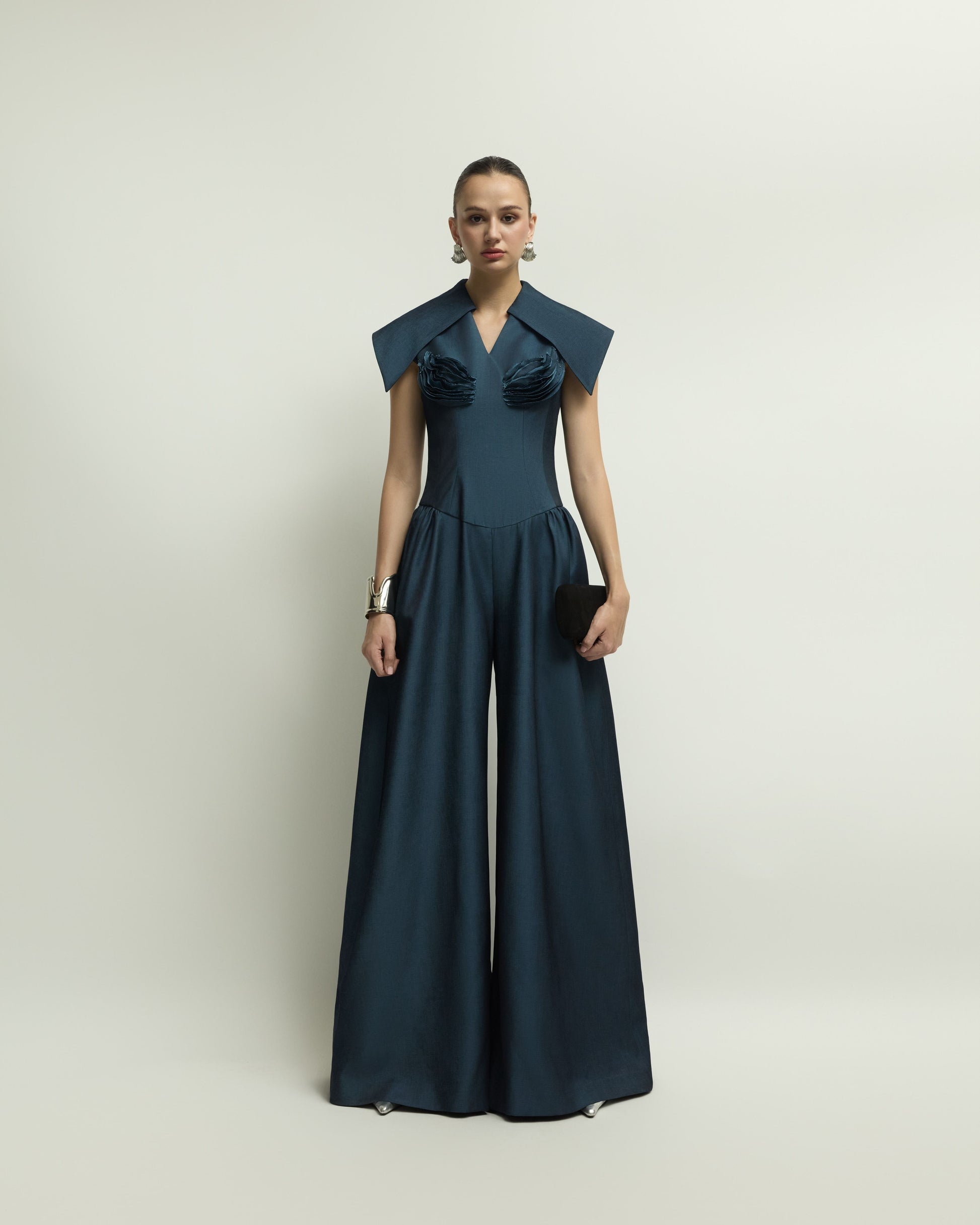 The ZELIE JUMPSUIT is a dynamic and bold piece for a strong, confident woman. It's crafted from a unique, lightweight, and soft silk-denim fabric. The fitted bodice, paired with wide, long legs, creates graceful movement with every step. The oversized, detachable collar adds a robust touch and offers versatile styling options. The bust is adorned with intricate layers of overlapping silk-denim, creating a striking and feminine detail that is both elaborate and unique.